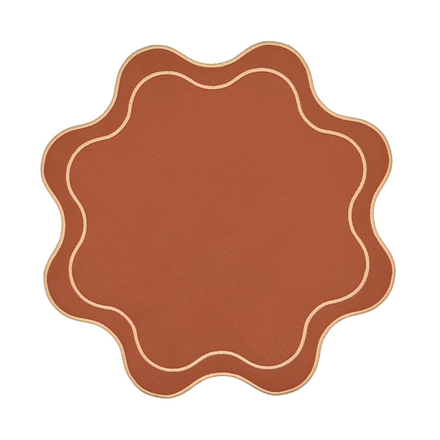 Enhance your table setting with these stunning round leather-vinyl placemats, designed for both beauty and functionality. Featuring a hand-woven scalloped edge, they add a touch of sophistication to any dining occasion.